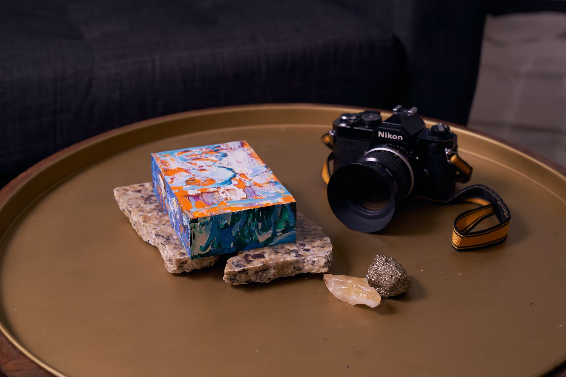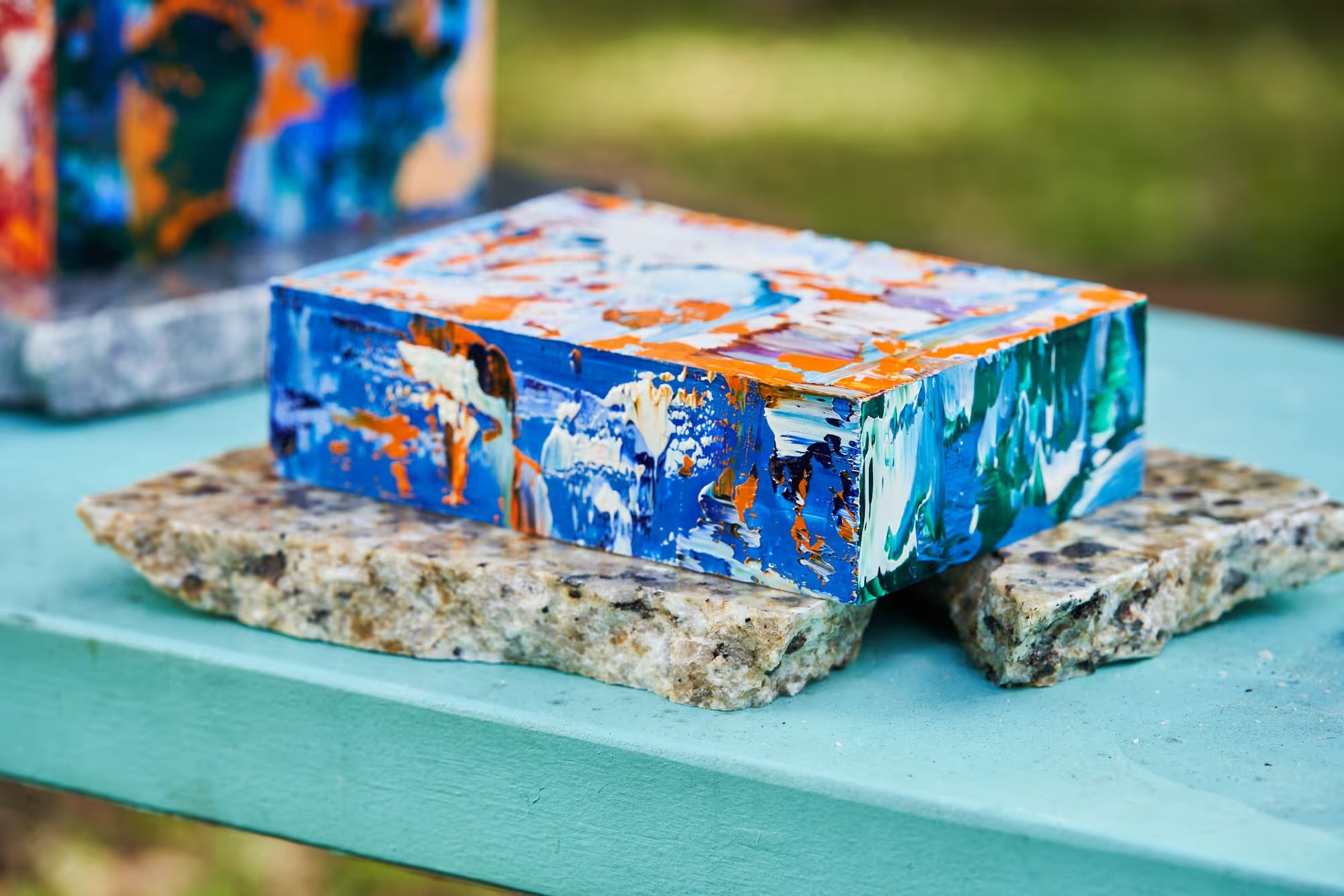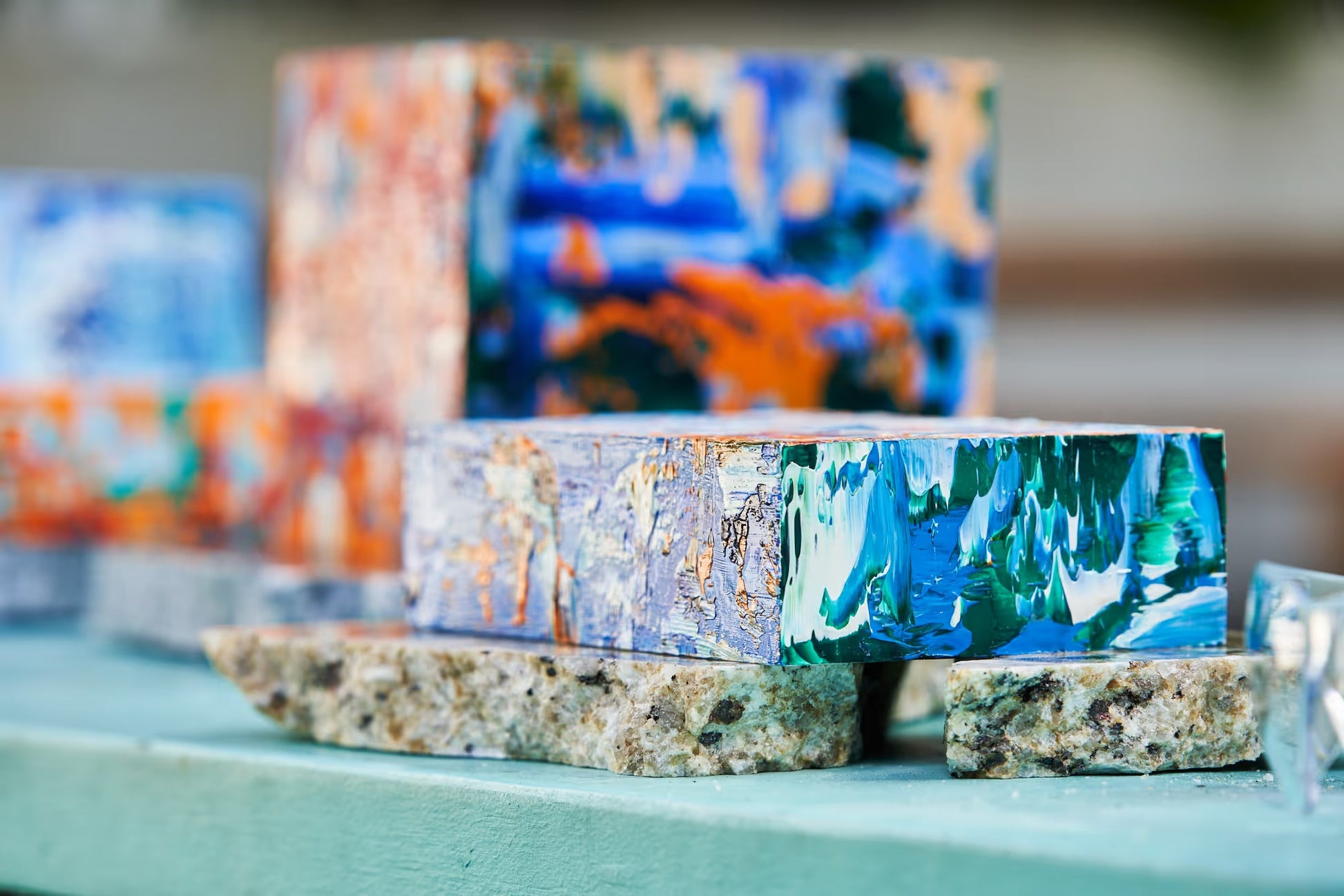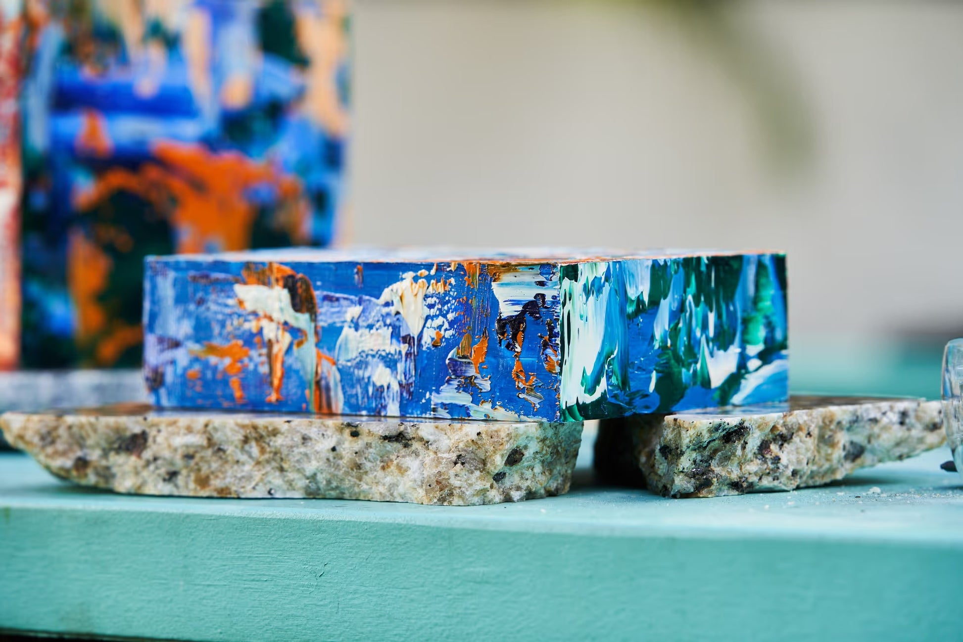 I saw them in my mind, and had to make them. I painted these cubes, and went on an adventure into the depths of Miami looking for scrap sheets of granite or marble. I found both, bought a chisel, and went to work assembling these.