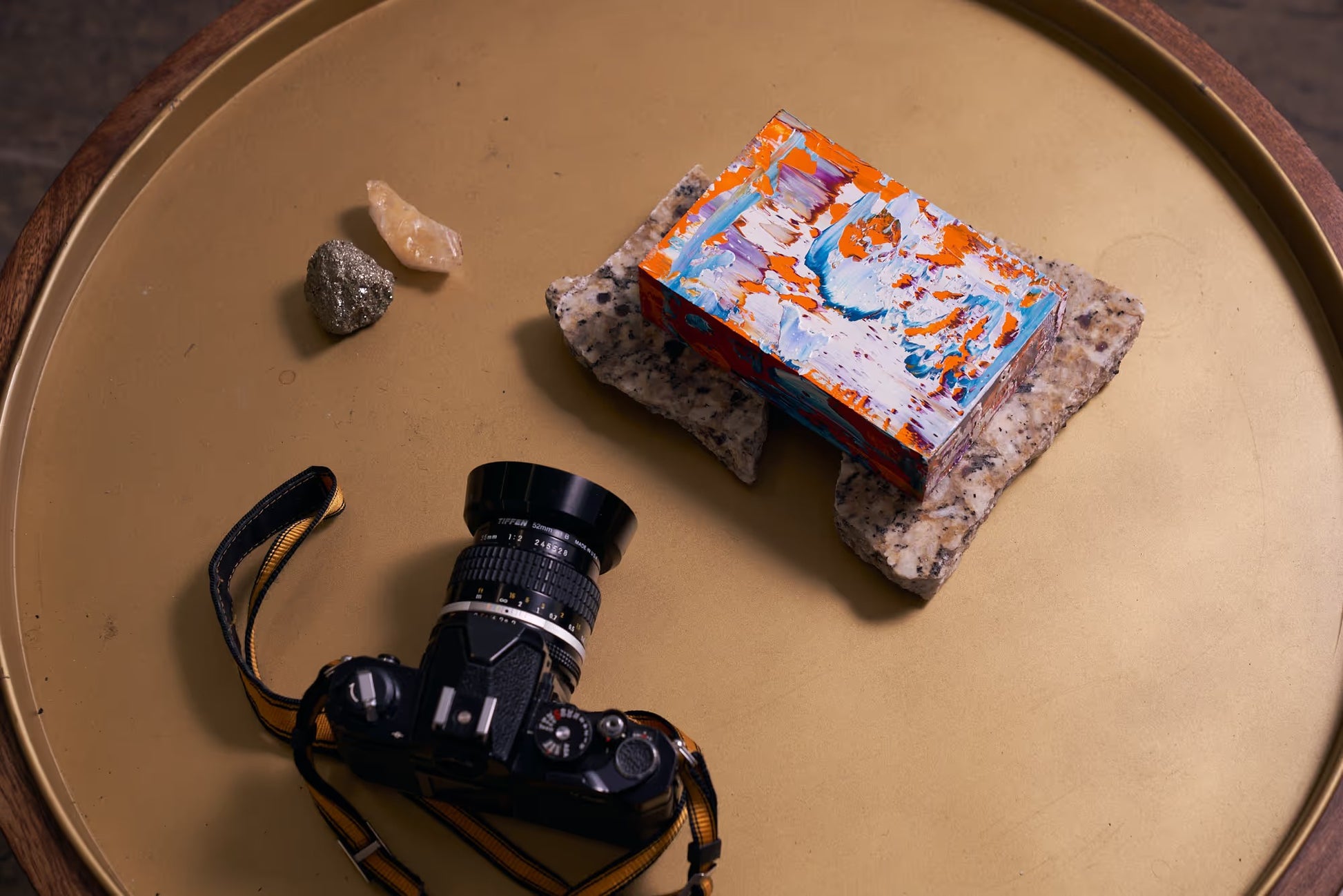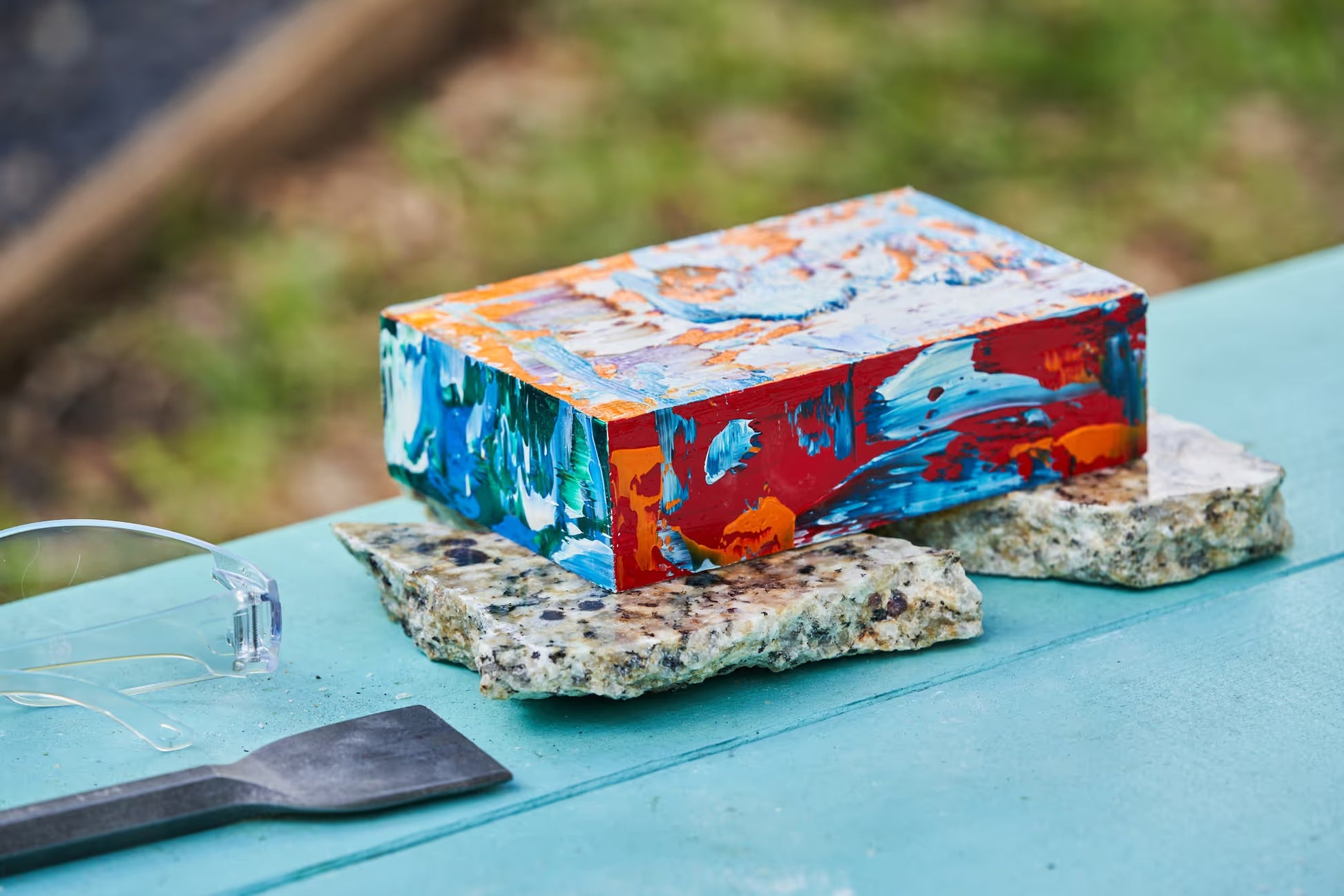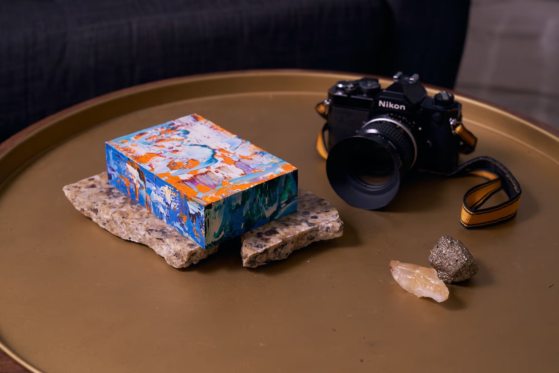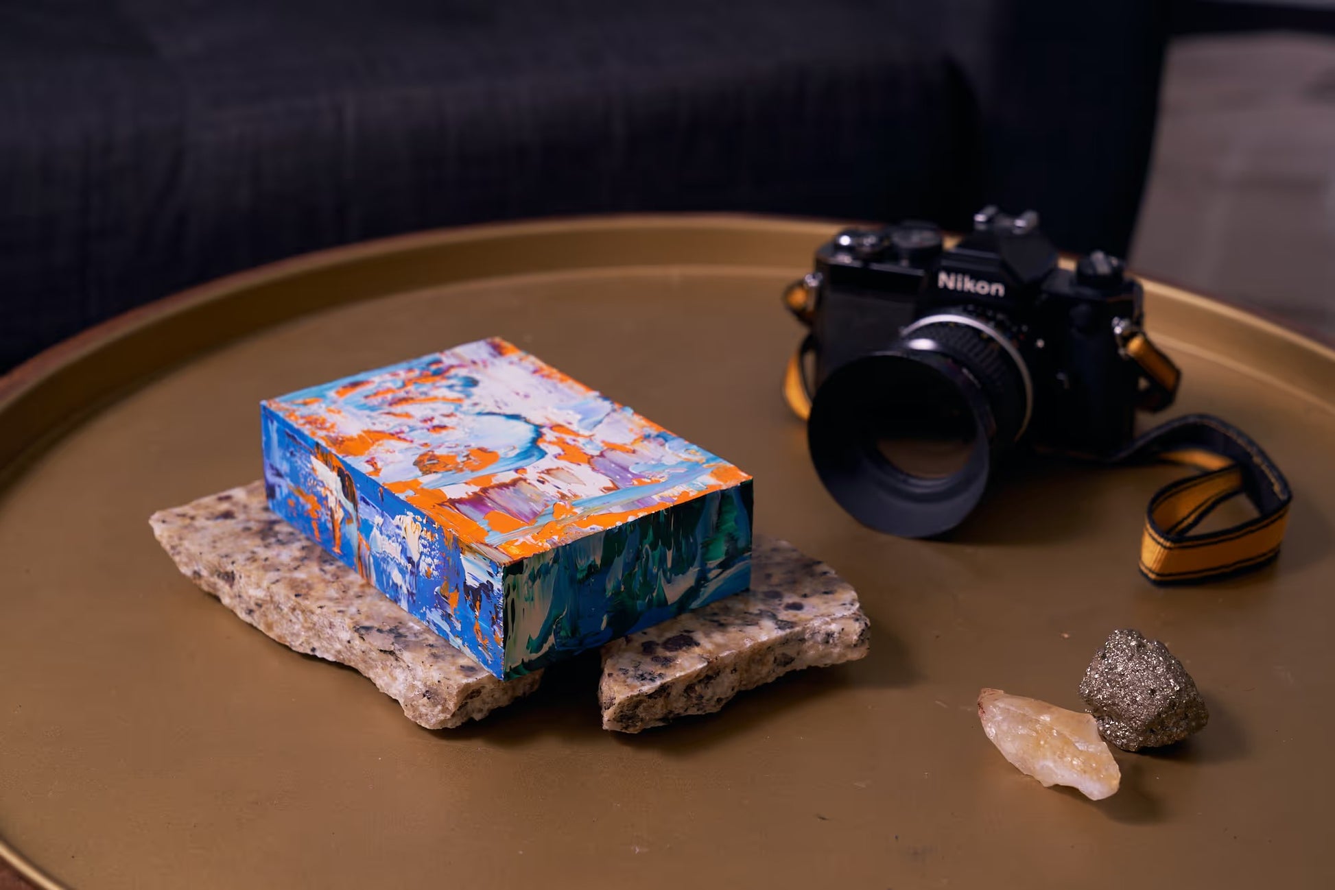 I saw them in my mind, and had to make them. I painted these cubes, and went on an adventure into the depths of Miami looking for scrap sheets of granite or marble. I found both, bought a chisel, and went to work assembling these.