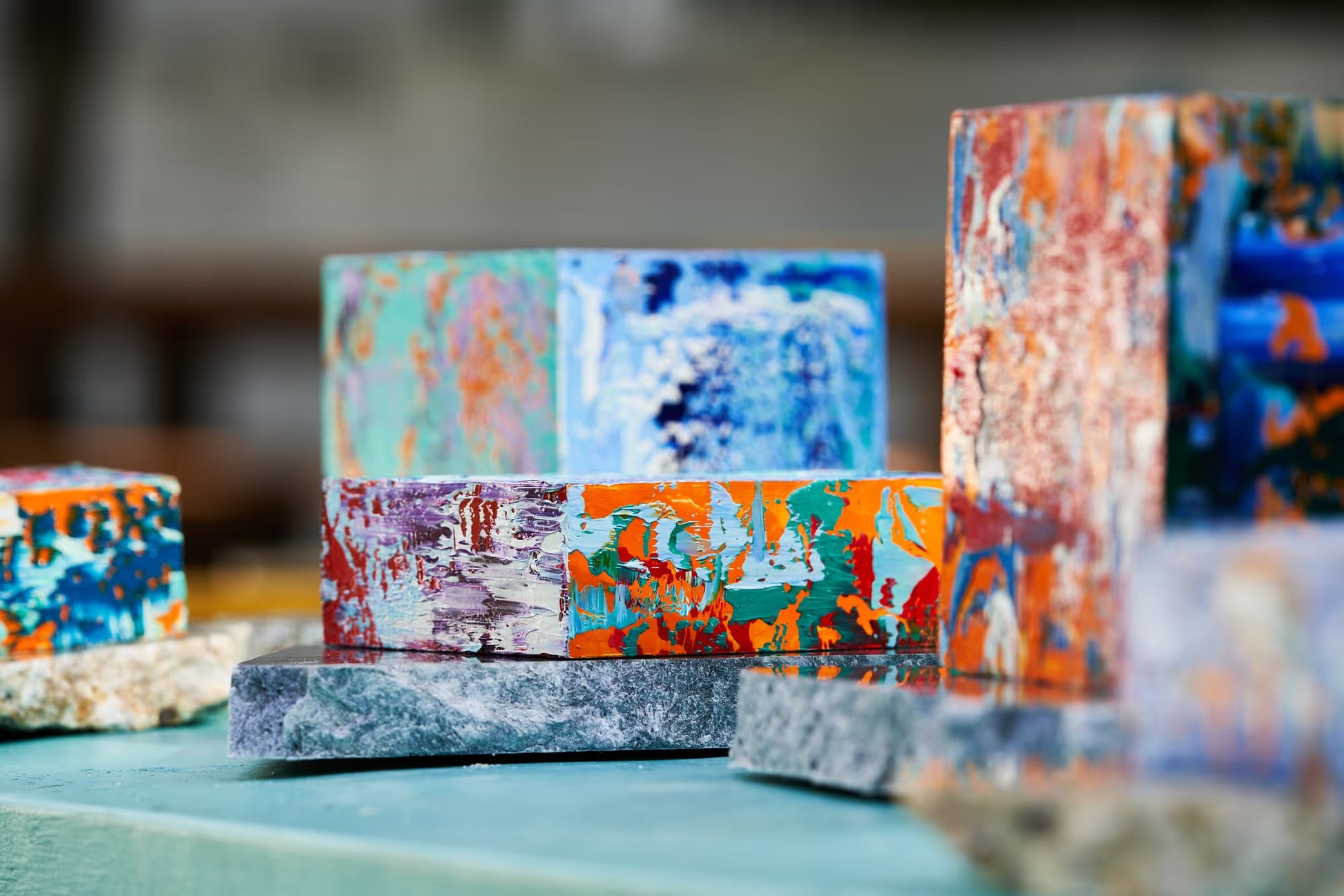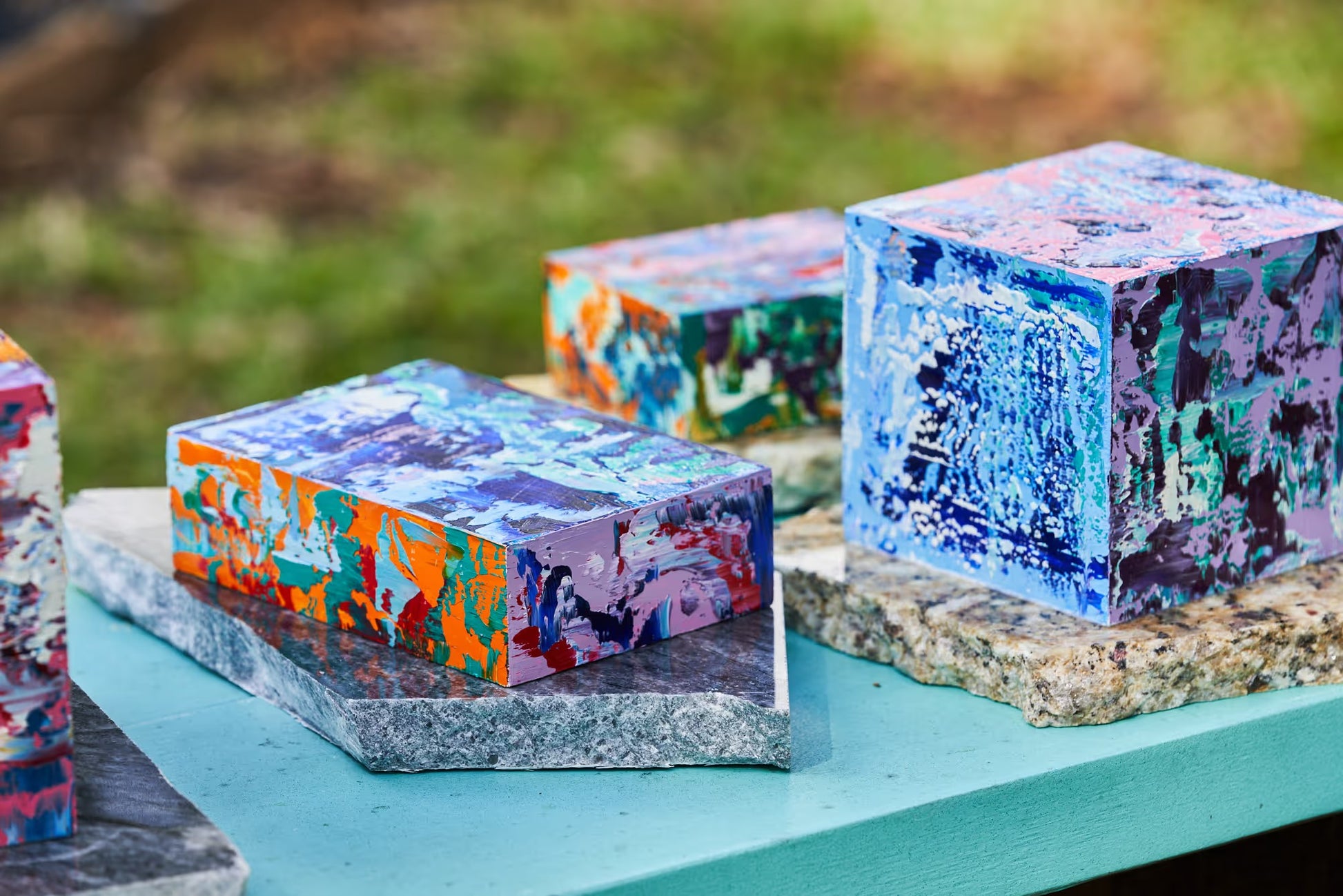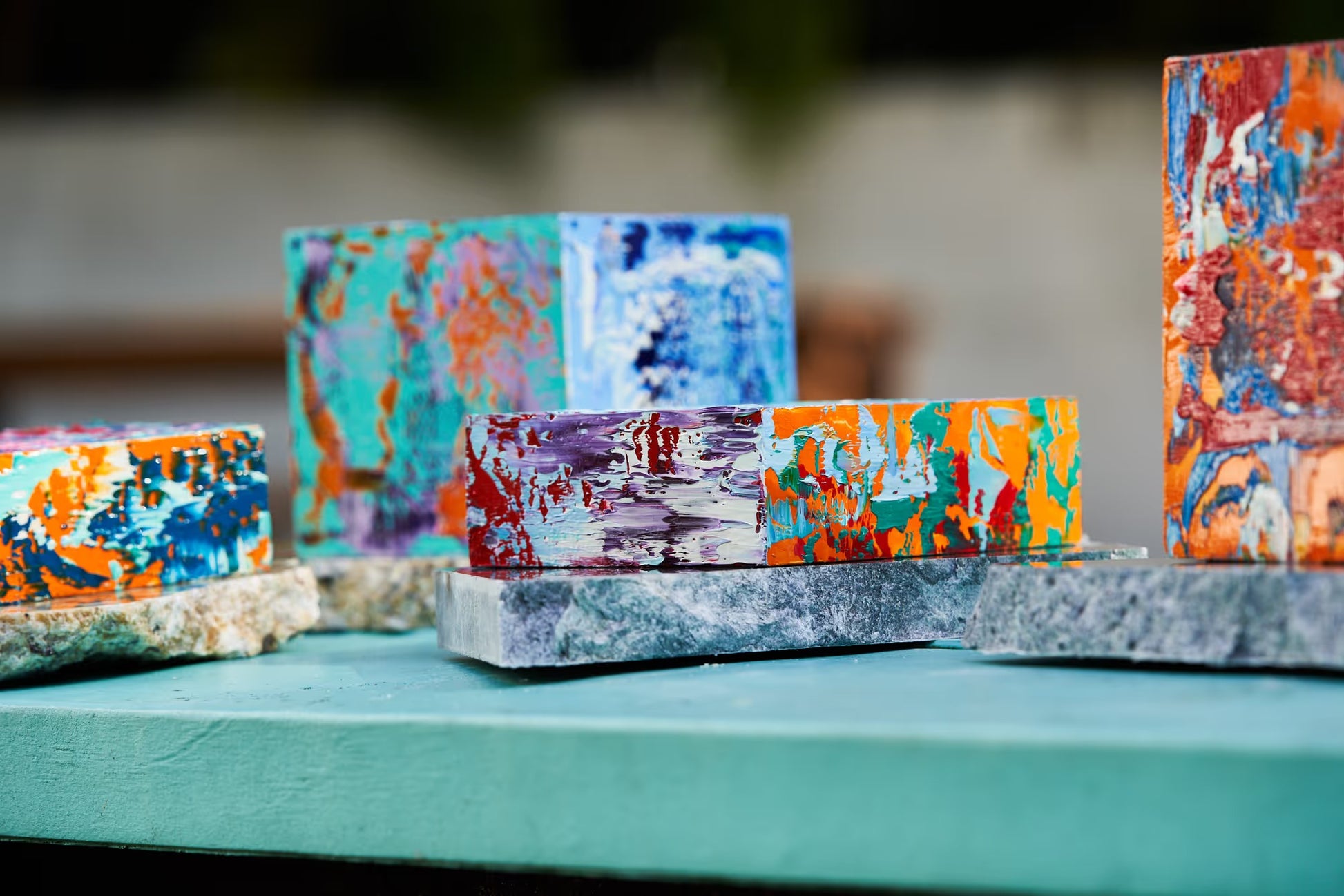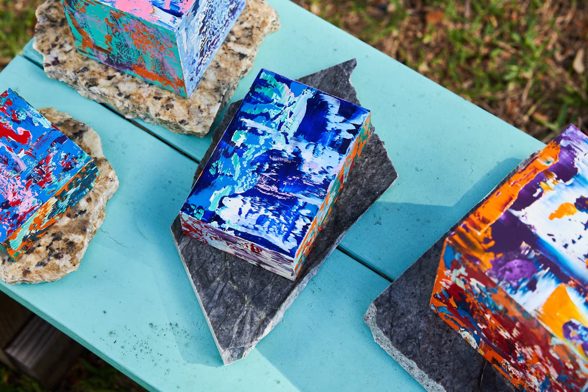 I saw them in my mind, and had to make them. I painted these cubes, and went on an adventure into the depths of Miami looking for scrap sheets of granite or marble. I found both, bought a chisel, and went to work assembling these.