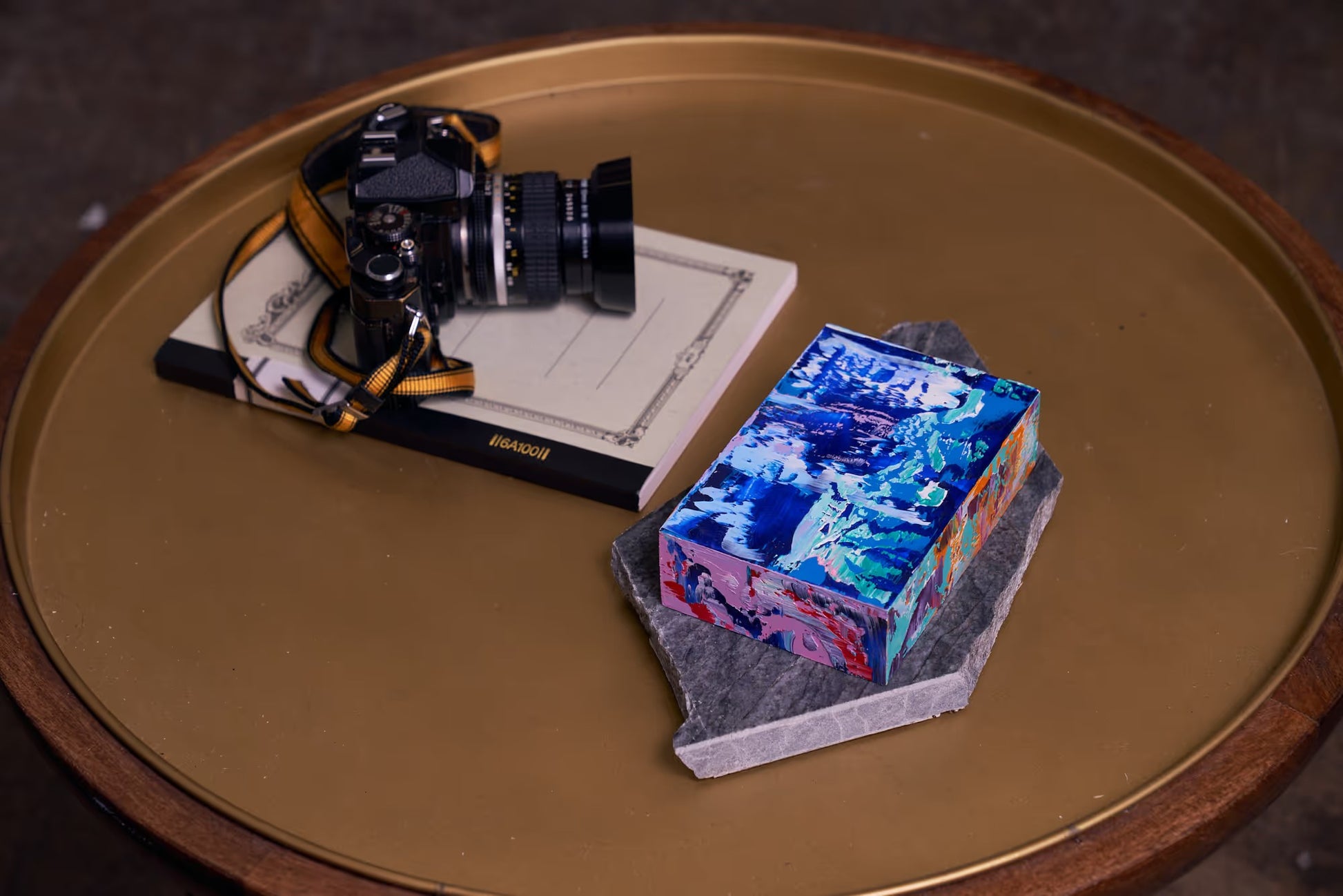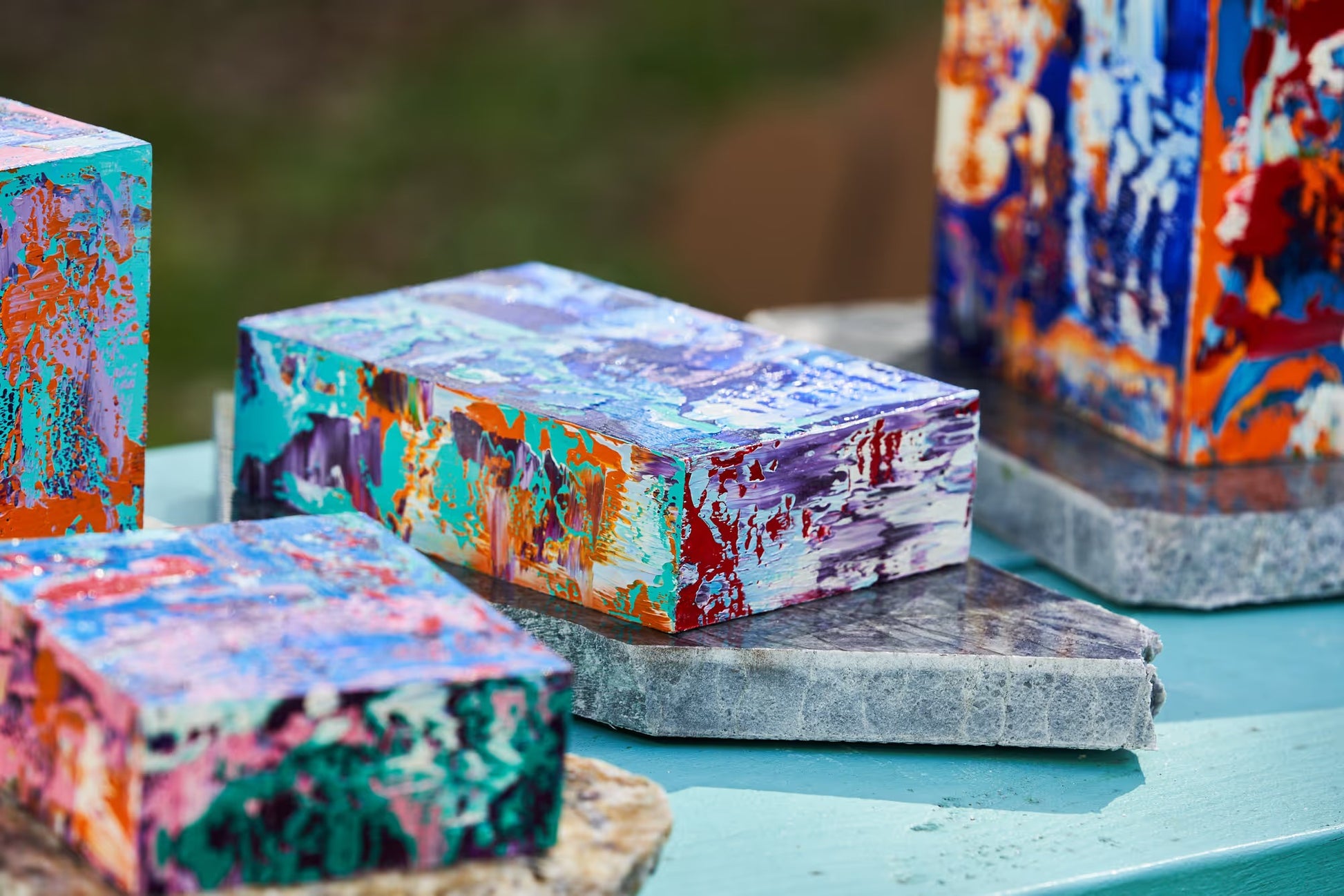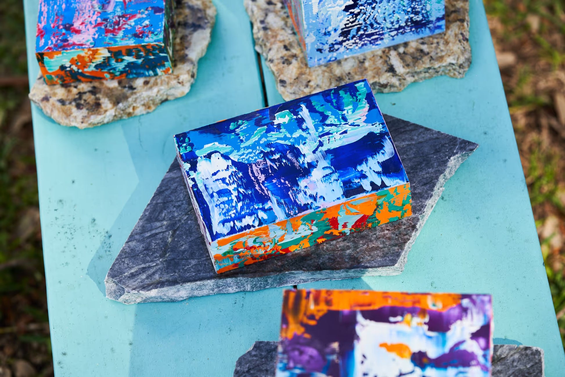 I saw them in my mind, and had to make them. I painted these cubes, and went on an adventure into the depths of Miami looking for scrap sheets of granite or marble. I found both, bought a chisel, and went to work assembling these.
