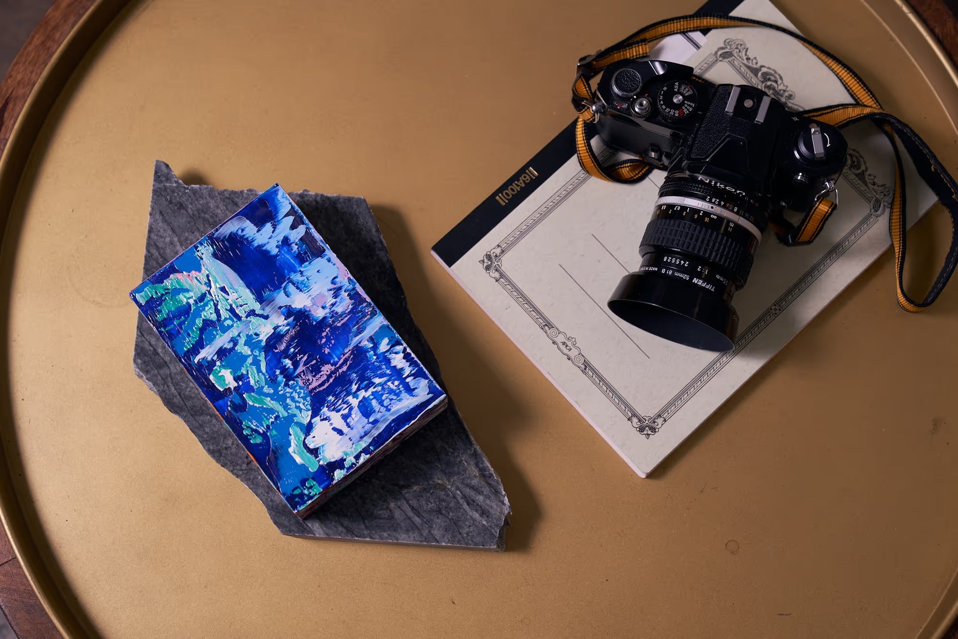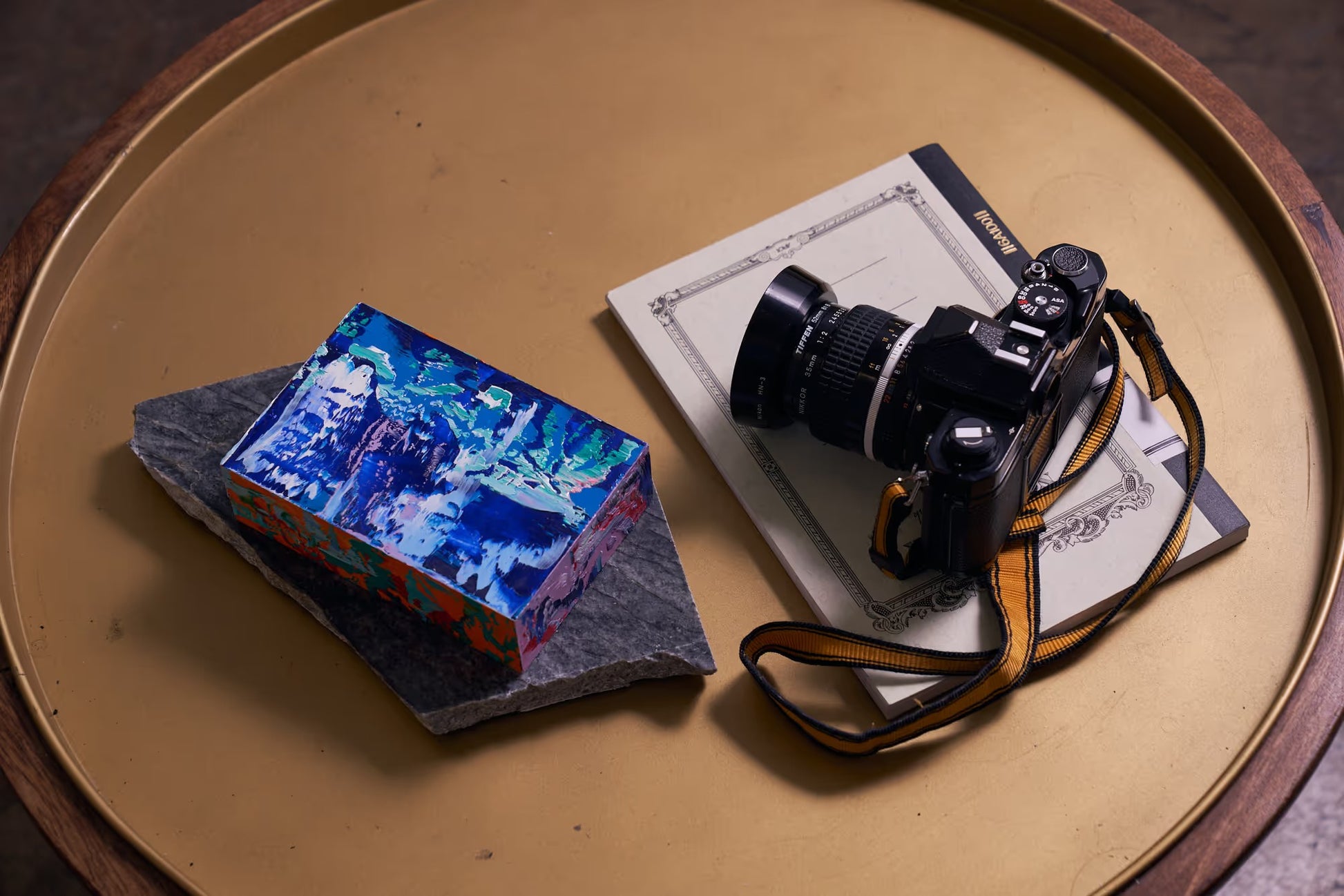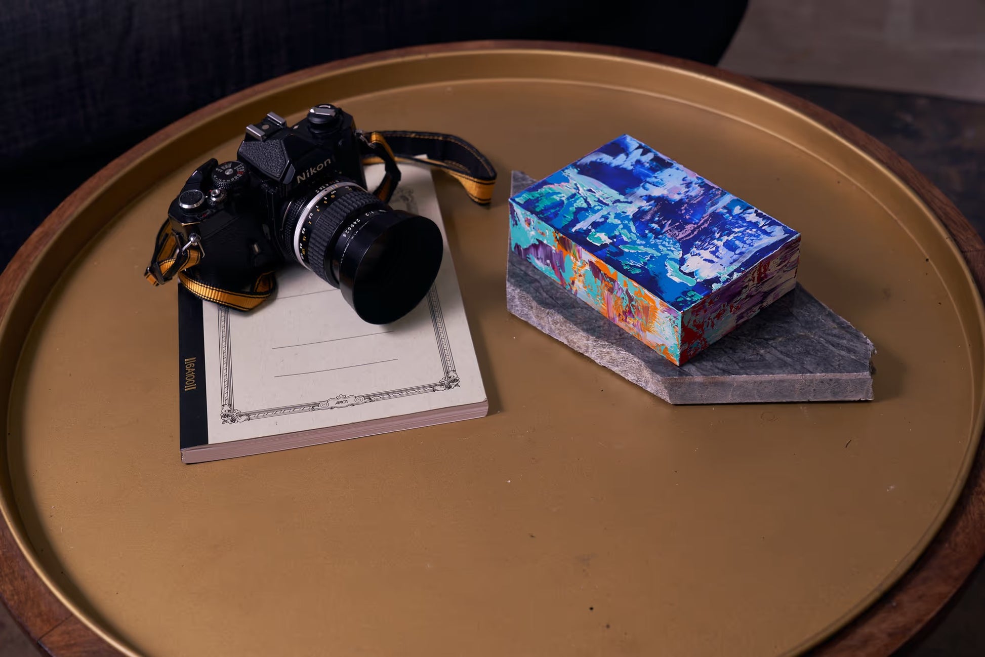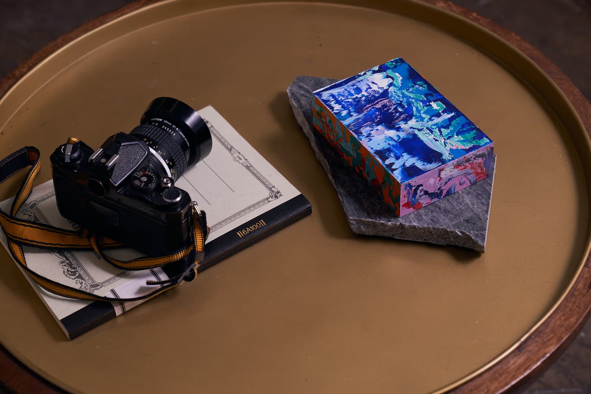 I saw them in my mind, and had to make them. I painted these cubes, and went on an adventure into the depths of Miami looking for scrap sheets of granite or marble. I found both, bought a chisel, and went to work assembling these.